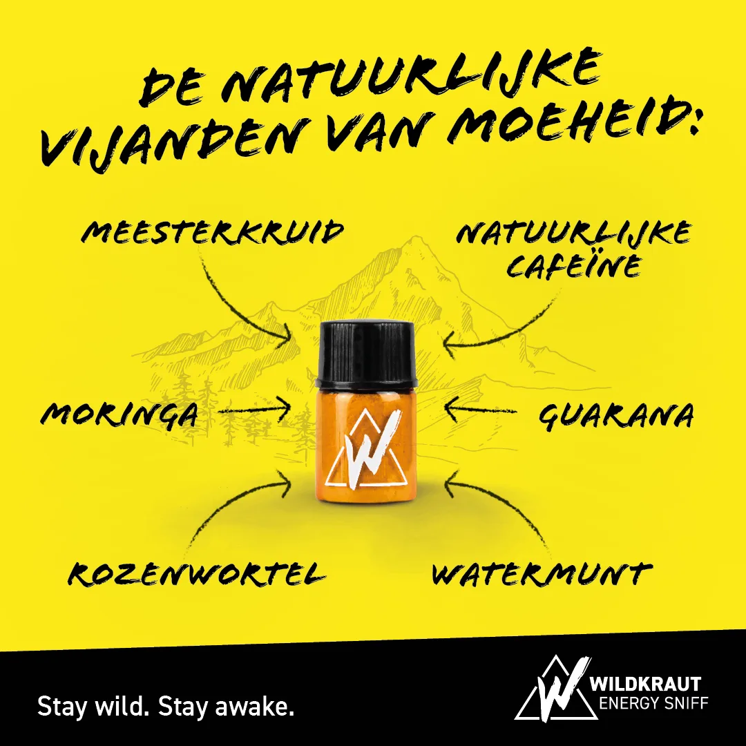Wildkraut Energy Sniff is dé snelle energieboost voor iedereen die geen tijd heeft om te vertragen. Deze krachtige blend van Alpenkruiden en natuurlijke energie-ingrediënten zoals cafeïne, guarana en moringa zorgt ervoor dat je binnen enkele seconden weer scherp staat. Geen suiker, geen crash, gewoon pure energie wanneer je het nodig hebt. Perfect voor feestbeesten, nachtbrakers en iedereen die net dat beetje extra power wil.